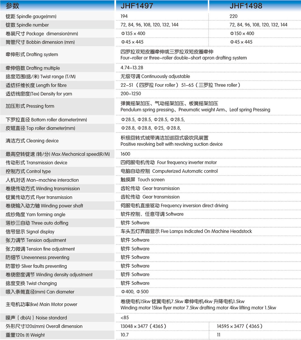 JHF1497/JHF1498全伺服電腦型粗紗機(jī),采用先進(jìn)的電腦控制技術(shù),四伺服電機(jī)分別驅(qū)動(dòng)錠翼,羅拉,卷繞,升降系統(tǒng),實(shí)現(xiàn)了四大運(yùn)動(dòng)系統(tǒng)的同步匹配,操作簡(jiǎn)單,自動(dòng)化程度高,成紗質(zhì)量好,是紡制優(yōu)質(zhì)粗紗的選擇。