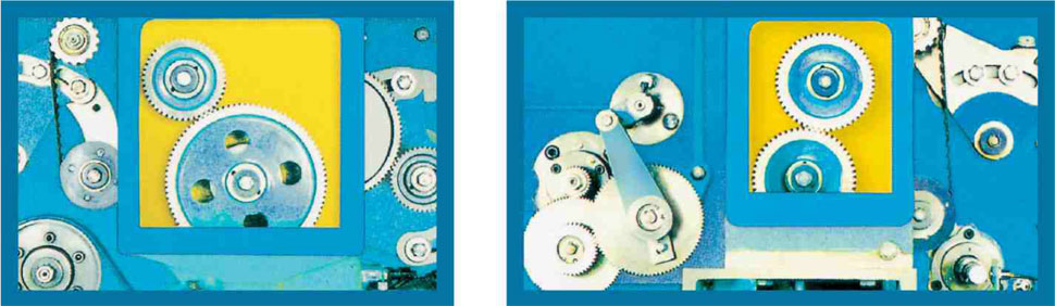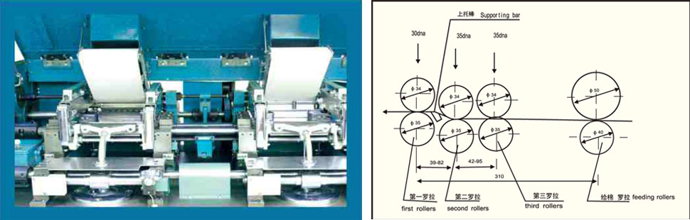 主電機采用雙繞組雙速電機,平皮帶傳給壓輥,同時由同步帶齒輪傳動其他部分,保證傳動比準確,使運轉(zhuǎn)過程中平穩(wěn)、噪音低。車頭車尾采用油浴斜齒輪箱,牽伸采用成對交換技術(shù),確保牽伸質(zhì)量。