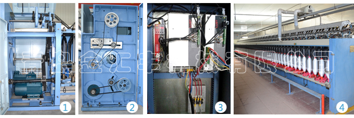 1. 羅拉牽伸、錠翼加捻、龍筋升降和筒管卷繞四部分運(yùn)動(dòng)分步傳動(dòng),由伺服電機(jī)通過(guò)同步帶直接傳動(dòng);采用圓弧齒同步帶傳動(dòng),傳動(dòng)精度高可獲得恒定的速比,傳動(dòng)平穩(wěn),更能適應(yīng)高速,降低噪音,不需要加油潤(rùn)滑,保養(yǎng)方便;